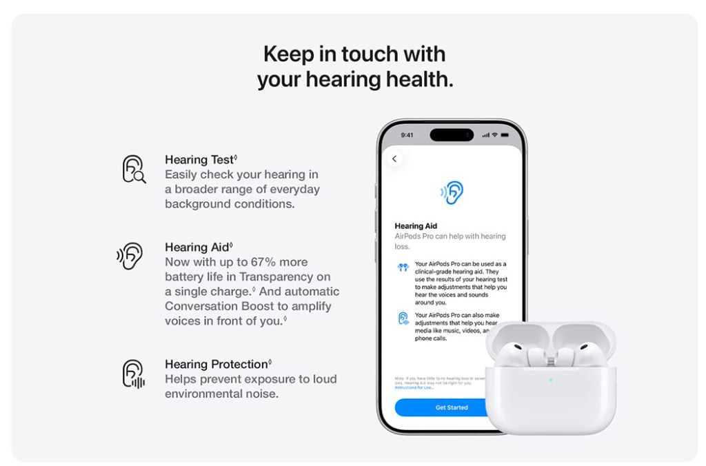 سلامت شنوایی - در راحتی خانه خود آزمایش شنوایی انجام دهید.* از ویژگی سمعک، اکنون با تقویت خودکار مکالمه، برای ارتباط واضحتر استفاده کنید.* و محافظت فعال شنوایی به جلوگیری از قرار گرفتن در معرض نویزهای بلند محیطی کمک میکند.*