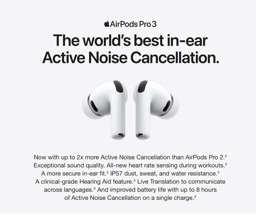 Apple AirPods Pro 3 Wireless Earbuds, Active Noise Cancellation, Live Translation, Heart Rate Sensing, Hearing Aid Feature, Bluetooth Headphones, Spatial Audio, High-Fidelity Sound, USB-C Charging