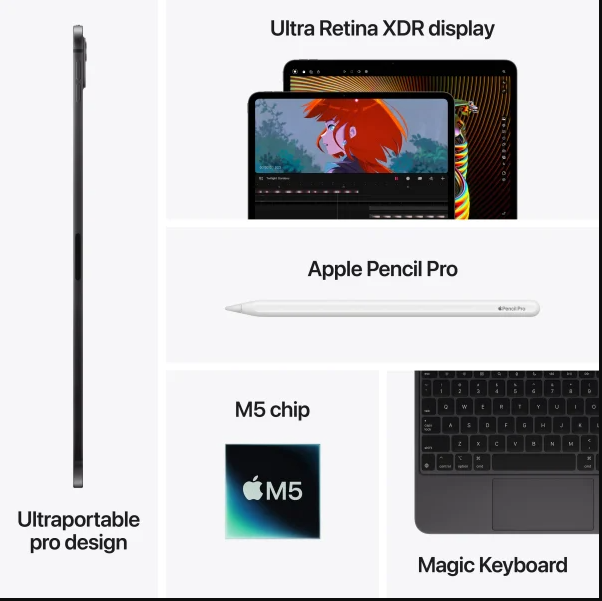 قدرت پردازش Apple M5 نسبت به نسل پیشین خود، M4، جهشی چشمگیر داشته و اجرای نرمافزارهای سنگینی مانند Final Cut Pro، Adobe Photoshop، DaVinci Resolve و اپلیکیشنهای طراحی سهبعدی را بدون کوچکترین افت سرعت ممکن کرده است. همچنین پشتیبانی از فناوری hardware-accelerated ray tracing و پهنای باند حافظهی 153 گیگابایت بر ثانیه، باعث میشود این تبلت در پردازش گرافیکی، نورپردازی و رندر صحنههای واقعگرایانه، عملکردی همسطح با سیستمهای حرفهای دسکتاپ داشته باشد.