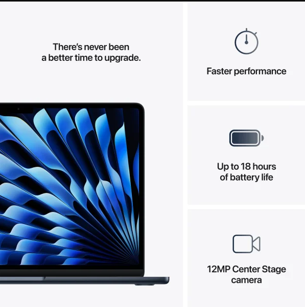 دوربین 12 مگاپیکسلی Center Stage کیفیت ویدئویی بهتری در شرایط نوری دشوار ارائه میدهد و بهطور خودکار شما را در کادر نگه میدارد. قیمت مک بوک ایر جدید را در سایت سافتپل مشاهده نمایید.
