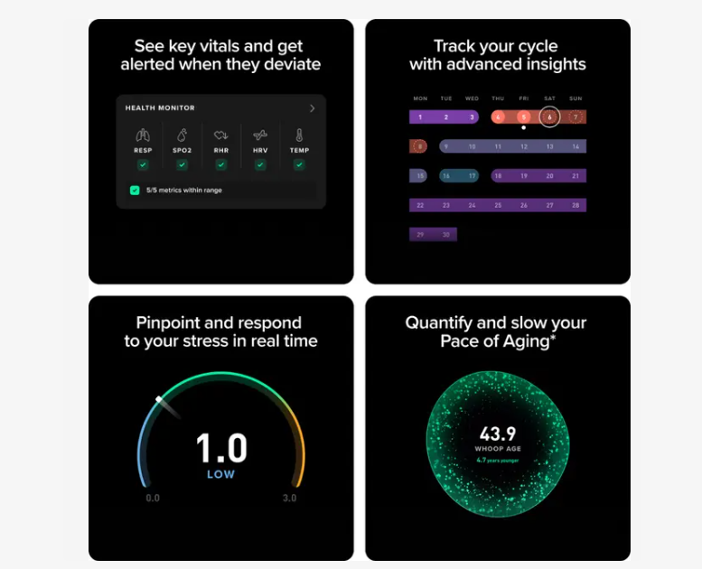 نمایش معیارهای حیاتی مانند ضربان و نوار قلب، کیفیت چرخه های خواب، اکسیژن خون، حداکثر اکسیژن مصرفی، استرس، چرخه قاعدگی،سرعت پیری، سن زیستی،تحلیل عملکرد ورزشی