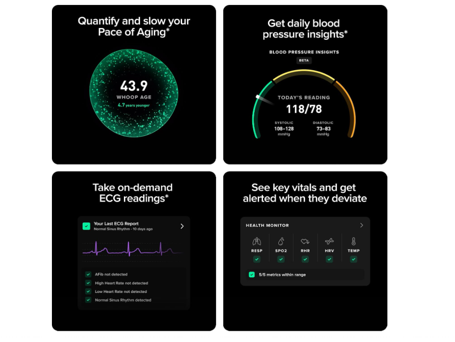 نمایش معیارهای حیاتی مانند ضربان و نوار قلب، کیفیت چرخه های خواب، اکسیژن خون، حداکثر اکسیژن مصرفی، استرس، چرخه قاعدگی،سرعت پیری، سن زیستی،تحلیل عملکرد ورزشی