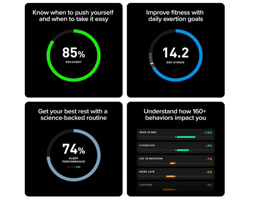 سنجش میزان آمادگی بدن از طریف آنالیز پیوسته تنوع ضربان قلب (HRV). مچ بند ورزشی WHOOP با استفاده از این متریک به شما کمک میکند تا ببینید بدن شما چه زمانی به بهترین شکل برای پذیرش فشار آماده است و چه زمانی نیاز به استراحت دارد. این ویژگی به ویژه برای ورزشکاران و افرادی که برنامههای فشرده ورزشی دارند، بسیار مفید است.